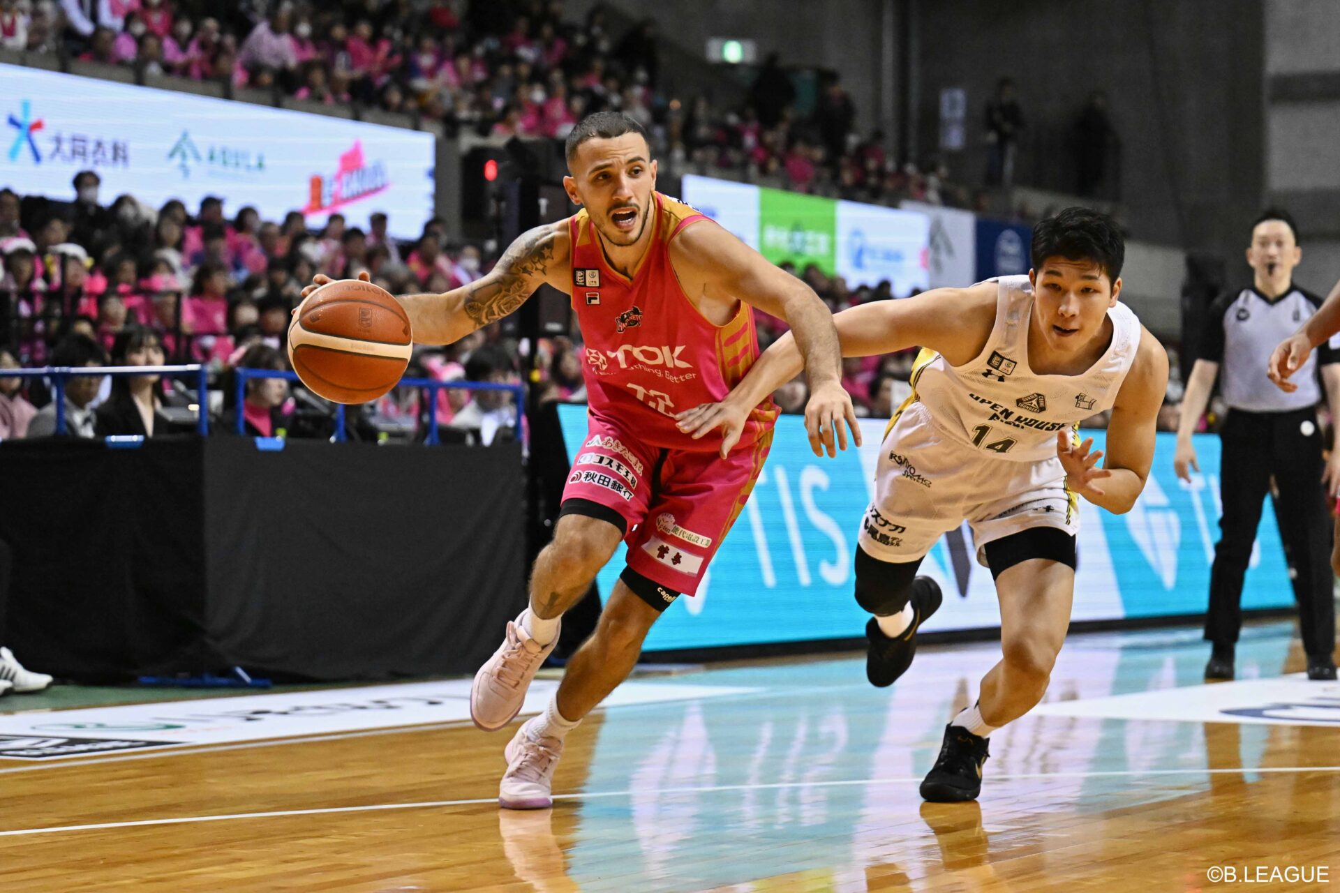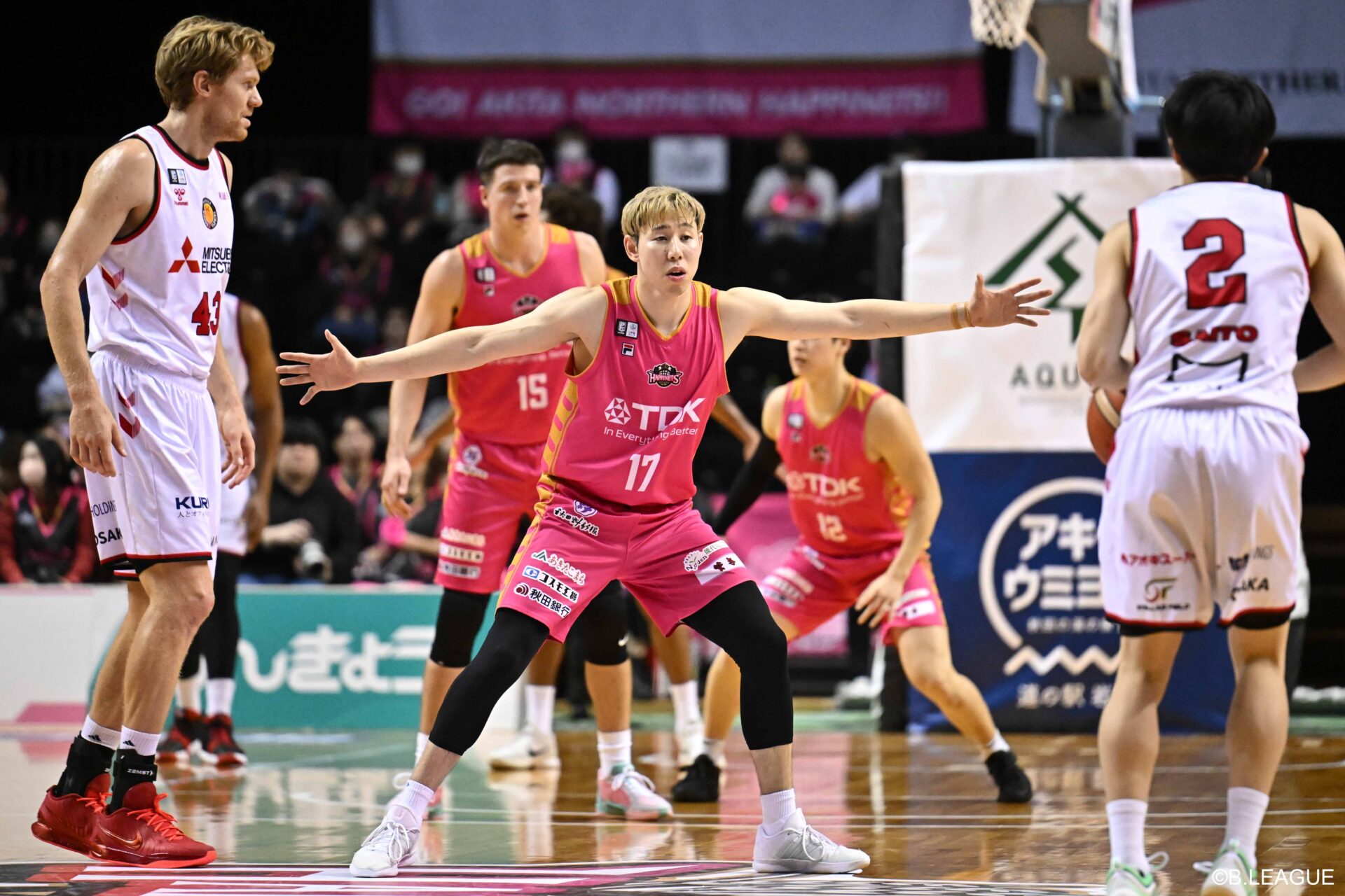 秋田の代名詞は、前線から激しいプレッシャーを仕掛けるアグレッシブなディフェンス。昨シーズンはリーグ1位のスティール数(平均8.2本)と4位の平均74.6失点を誇り、その強みを存分に発揮した。しかし今シーズンは、第11節終了時点での平均失点が83.9点と思うようなディフェンスを発揮できていない。