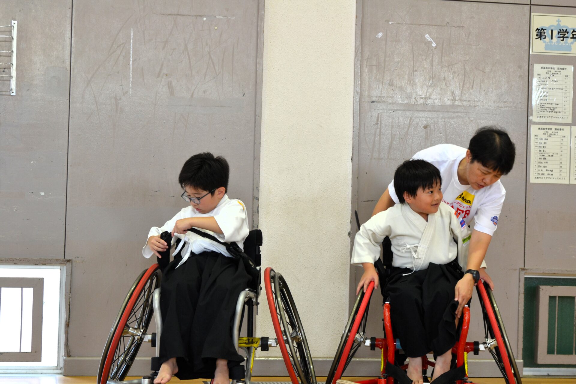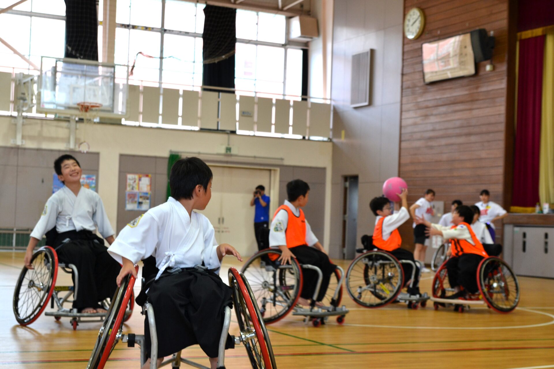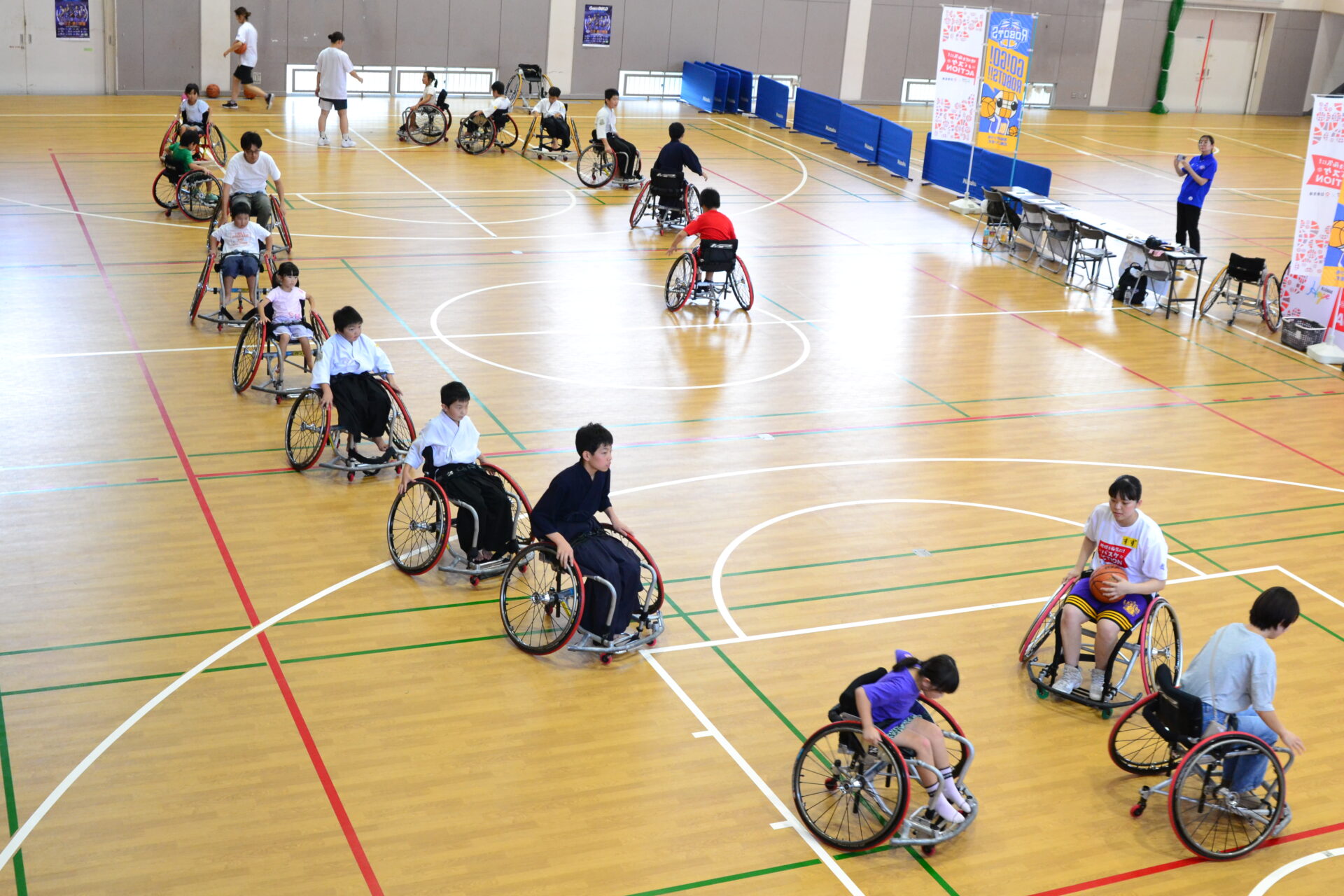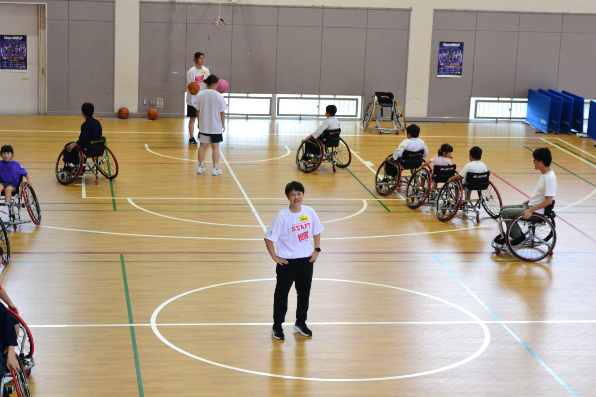 体験会の会場となった村立東海南中の体育館にも多くの参加者が足を運び、子どもから大人まで様々な年代の方々に車いすバスケを体験していただくことが出来ました。