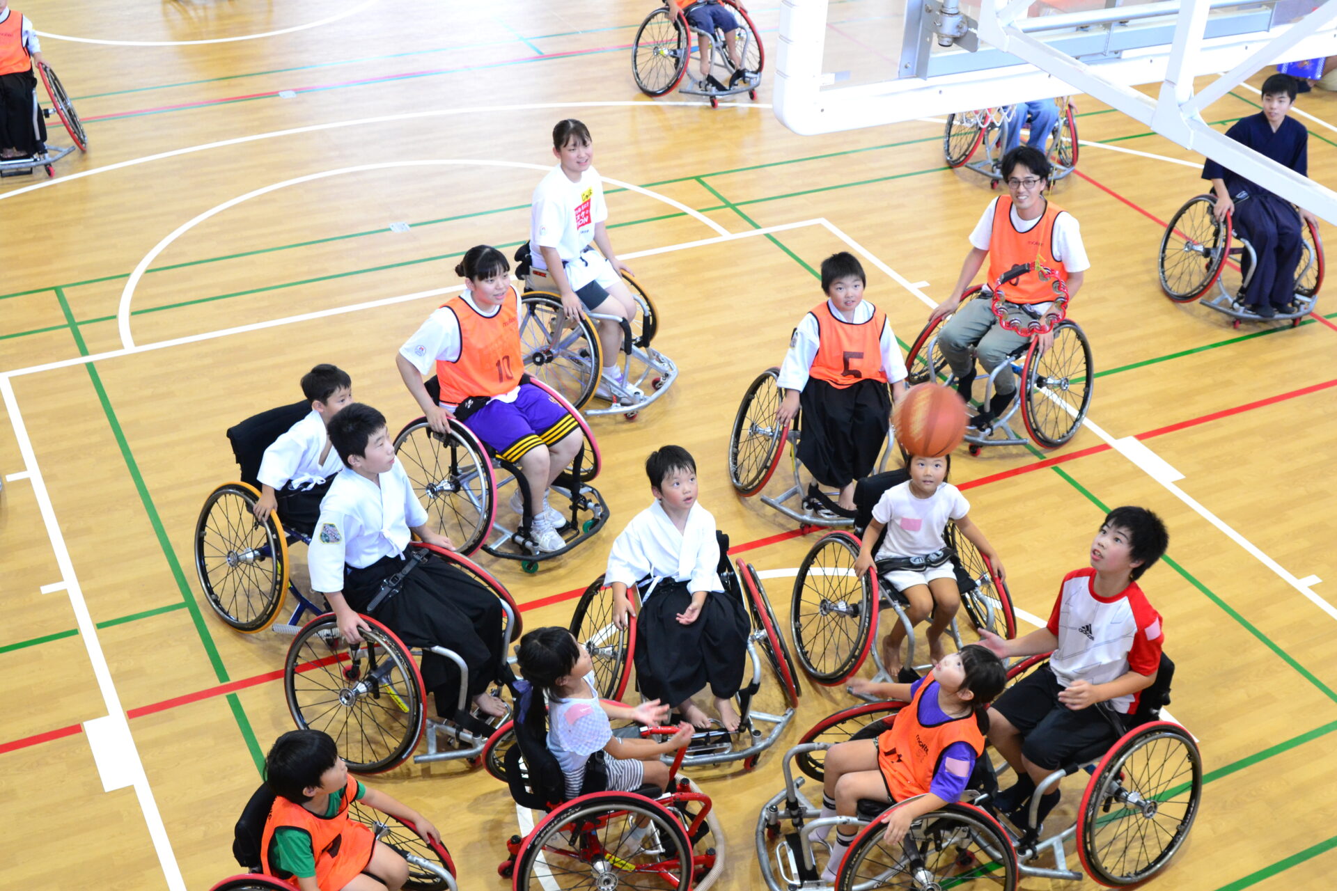 続いて行われたシュート練習では、通常のバスケットゴールの他にリングに吊り下げたタンバリンが用意され、自分が無理なく狙えるゴールを目指しシュートを放ちます。小さな子どもたちも、初めて車いすに座ったとは思えないほど器用に乗りこなし、スムーズにシュートの列に並んでいる姿がとても印象的でした。
